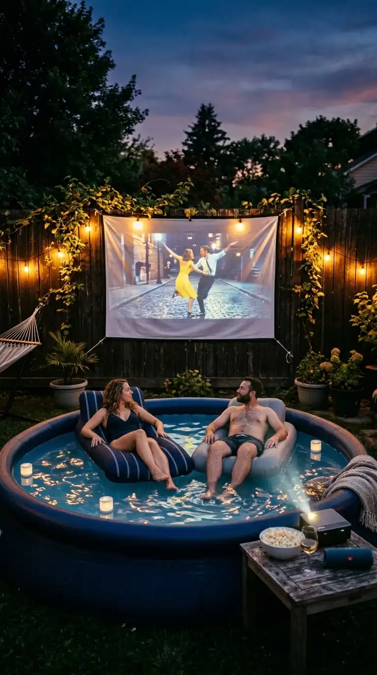 Image Prompt: An inflatable pool at dusk. A white projector screen is hung from a fence behind the pool. A movie image is visible on the screen. Two people float in the pool on inflatable loungers looking toward the screen. A small projector sits on a table to the side. Cinematic, dreamy, unforgettable.