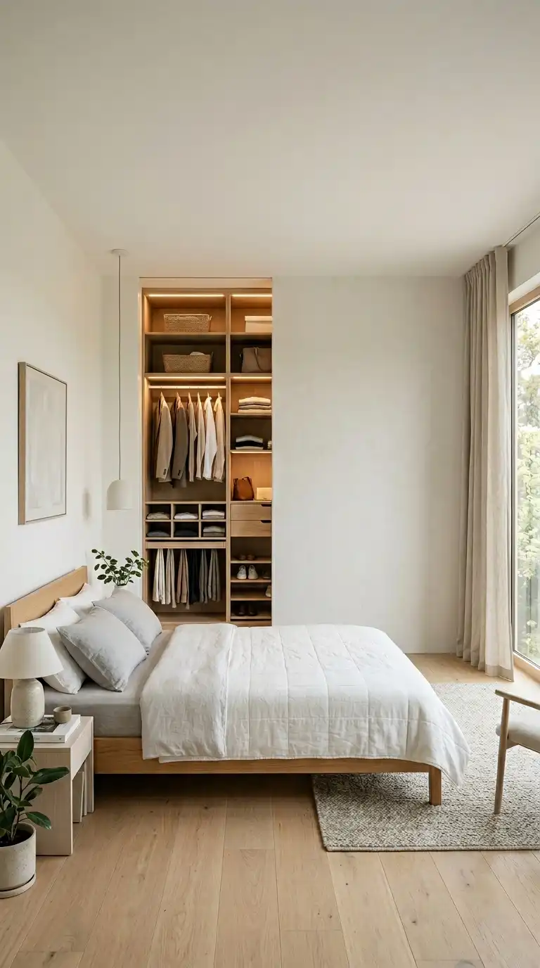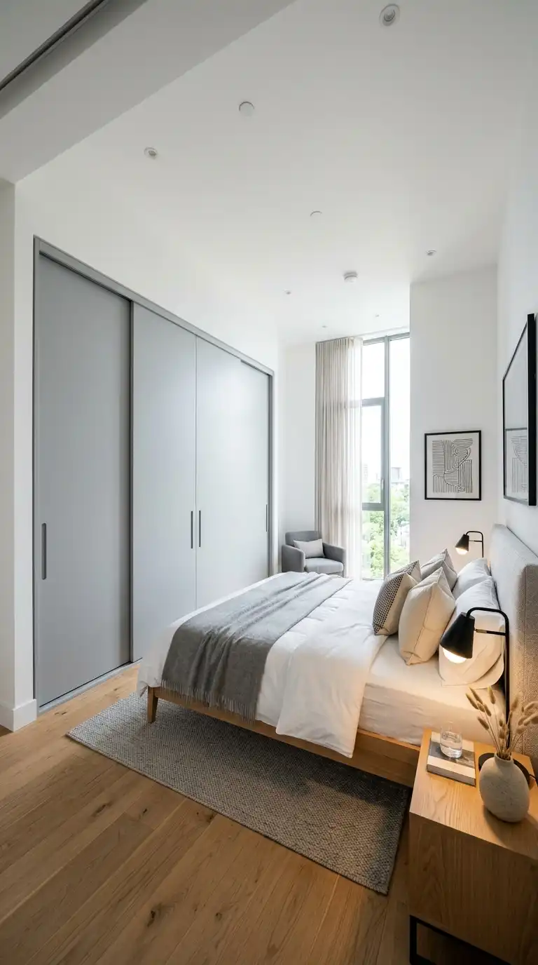 Floor-to-ceiling sliding wardrobes maximize vertical storage while creating a seamless, architectural look. The doors extend from floor to ceiling, eliminating the gap above traditional wardrobes and drawing the eye upward to create the illusion of higher ceilings. Integrated handles—recessed into the door itself—maintain a clean, unbroken surface that feels minimalist and sophisticated. Choose matte finishes in neutral tones like soft gray, warm beige, or charcoal for a contemporary, understated aesthetic.