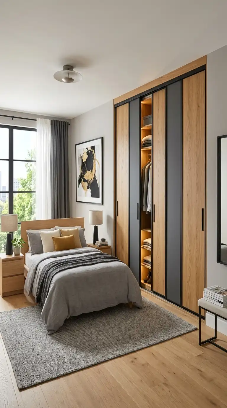 Two-tone sliding wardrobes add visual interest and personality by combining two complementary finishes within a single design. Popular combinations include light wood with matte white, dark wood with high-gloss gray, or matte black with natural oak. Use one finish for the main door panels and another for vertical accent strips, or create a horizontal division that defines different storage zones. This approach breaks up large expanses of cabinetry and creates a custom, designer look that feels unique and intentional.