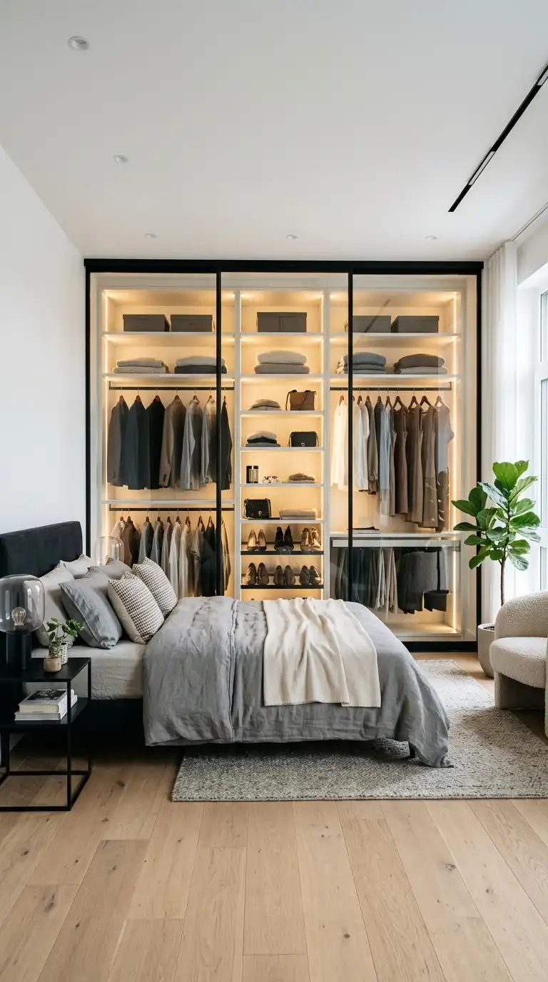Glass and metal sliding wardrobes offer a sleek, industrial-inspired aesthetic that is both modern and timeless. Combine clear, frosted, or tinted glass panels with slim metal frames in black, brass, or brushed nickel. The transparency of the glass creates a light, open feel, while the metal frames add structure and definition. This design is perfect for contemporary, industrial, and urban bedrooms where a minimalist, architectural look is desired. Interior LED lighting enhances the glass panels and showcases the wardrobe’s contents.
