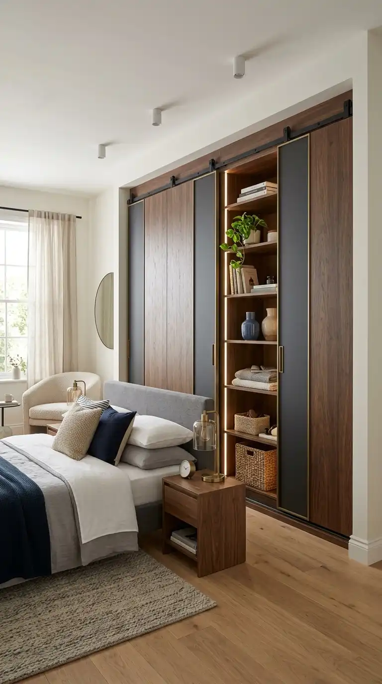 Break away from traditional symmetrical layouts with an asymmetrical sliding wardrobe design. Use doors of varying widths, or combine sliding panels with open shelving or a dressing niche. This approach creates a dynamic, custom look that feels unique and tailored to your space. Asymmetrical configurations are ideal for bedrooms with alcoves, sloped ceilings, or irregular wall spaces, allowing you to maximize storage while creating a visually interesting design.