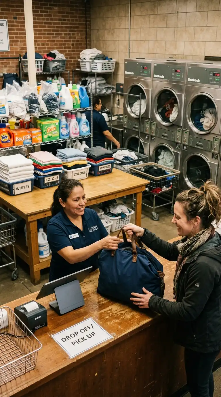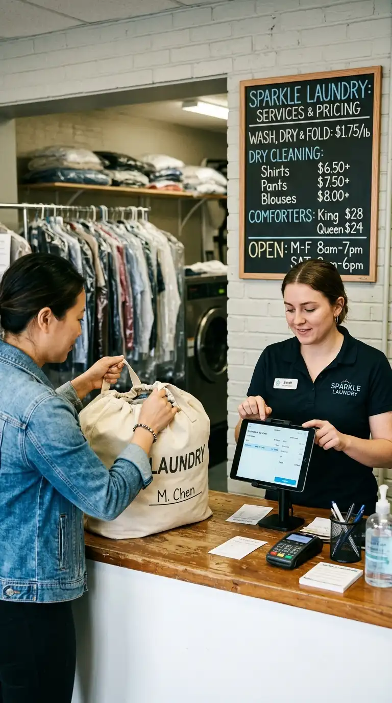 A welcoming drop-off counter is essential for any laundry business. Use a long counter at a comfortable height. Add a computer or tablet for order processing. Use clear bins for incoming and outgoing orders. Install a sign with your pricing and services. Friendly, efficient service at the counter builds customer loyalty.