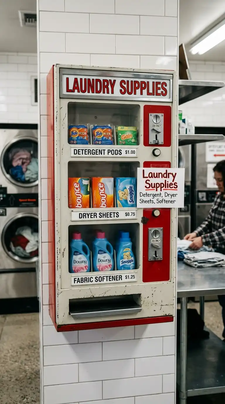 Offer laundry supplies for sale. Install a vending machine or a shelving unit with detergent pods, dryer sheets, fabric softener, and stain removers. This provides convenience for customers who forgot supplies and generates additional revenue. Use clear pricing and attractive displays.
