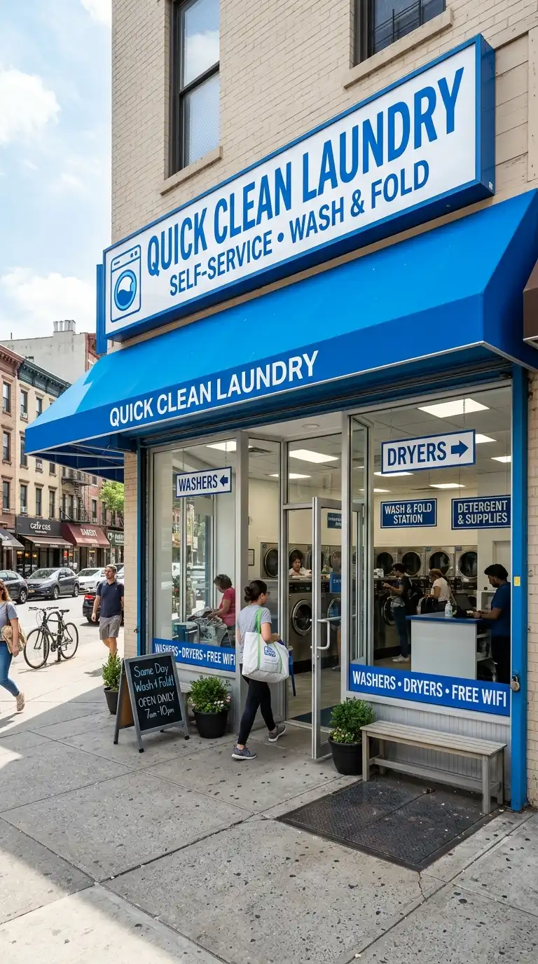 Good signage helps customers navigate your shop and reinforces your brand. Use a large exterior sign with your business name. Inside, use clear signs for “Washing,” “Drying,” “Folding,” “Restroom,” and “Supplies.” Use your brand colors for consistency. A professional, cohesive look builds trust.
