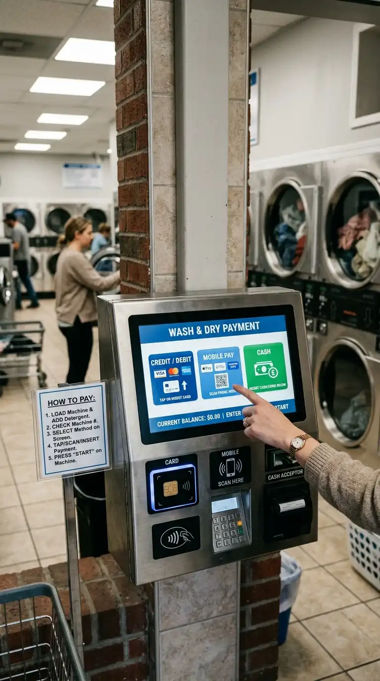 Install a digital payment kiosk where customers can add value to cards or pay for cycles using credit cards, mobile payments, or cash. Digital payments reduce the need for coin handling and appeal to younger customers. Display clear instructions for use.