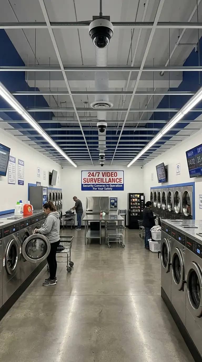 Security is important for unattended laundromats. Install visible security cameras and bright LED lighting throughout the shop. This deters theft and vandalism and makes customers feel safe. Post a sign indicating that the premises are under video surveillance. Good lighting also improves the customer experience.