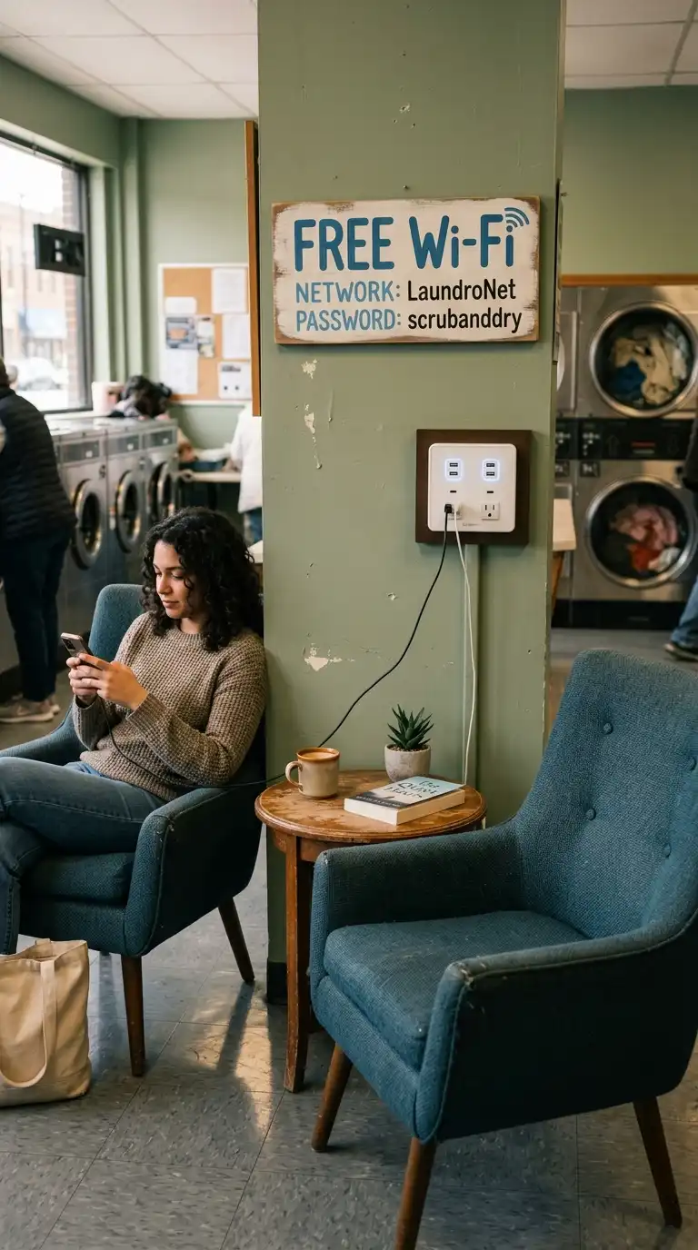 Even a small laundromat should have a comfortable waiting area. Provide benches or chairs, a small table, and free Wi-Fi. Add phone charging stations. A comfortable waiting area encourages customers to stay rather than leave, potentially increasing ancillary sales from vending machines.