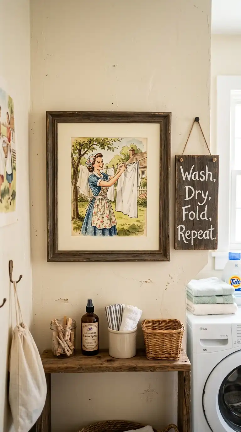 Laundry-themed wall art adds personality and a touch of humor to the room. Look for prints, signs, or framed embroidery featuring laundry-related quotes, vintage laundry advertisements, or illustrations of washing machines and clotheslines. A sign reading “Wash, Dry, Fold, Repeat” or “Laundry Today or Naked Tomorrow” adds a fun touch.