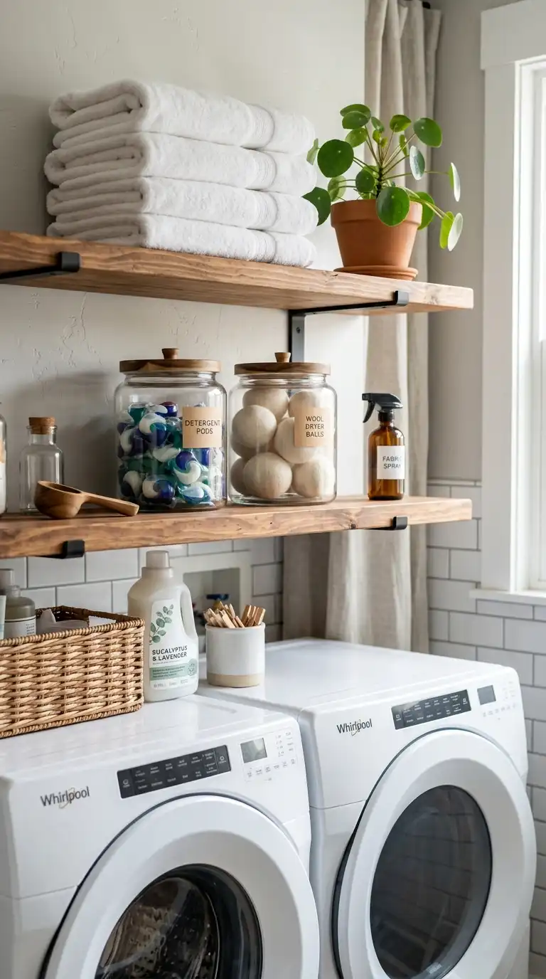Open shelving allows you to display pretty containers, glass jars, and folded towels while keeping essentials within reach. Use wooden or metal shelves mounted above the washer and dryer or on an empty wall. Arrange glass jars filled with detergent pods, wool dryer balls, and clothespins. Stack neatly folded white towels on the shelves for a spa-like look.