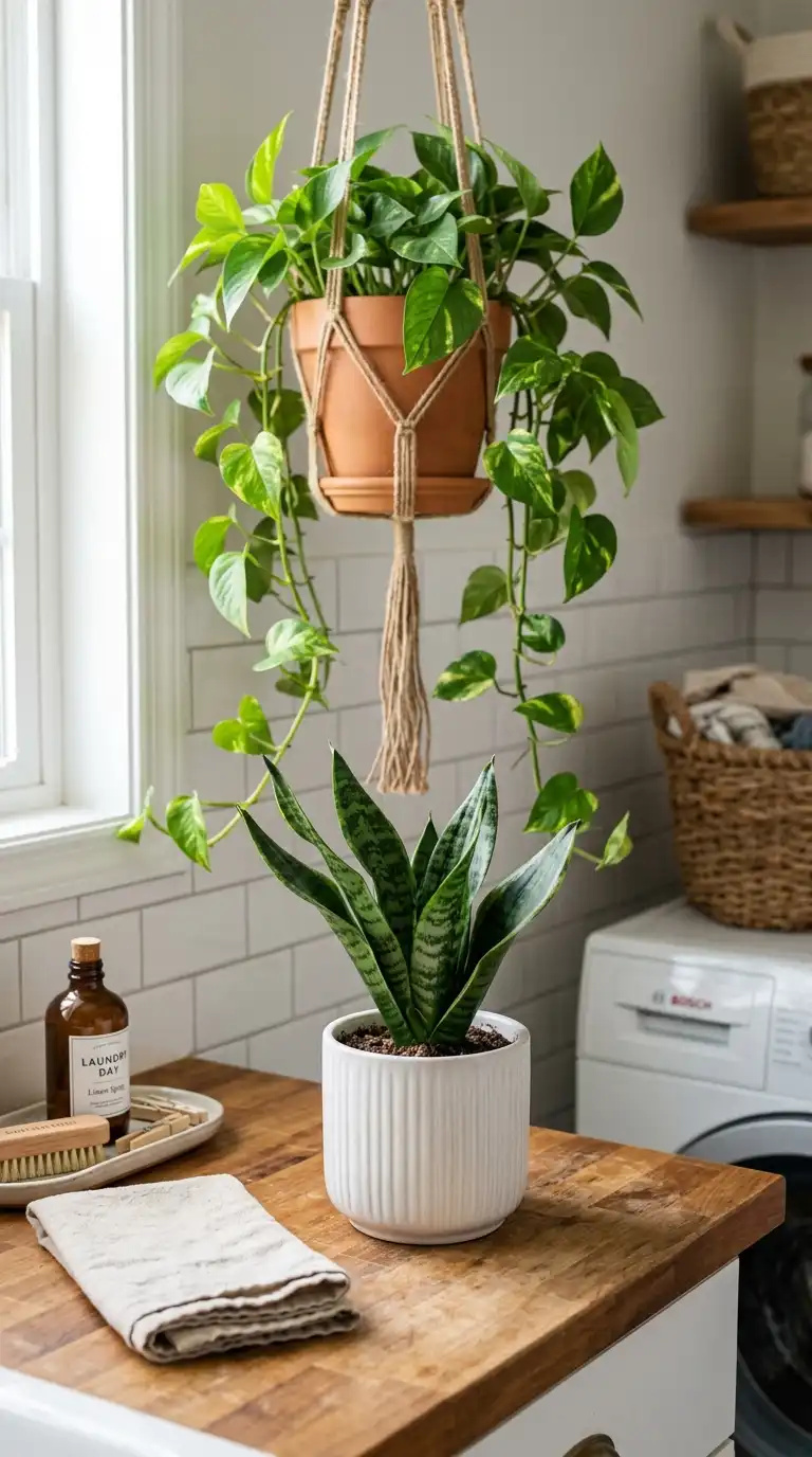 Plants bring life to any room, including the laundry room. Choose low-maintenance, humidity-loving plants like pothos, snake plant, or peace lily. If natural light is limited, use high-quality artificial plants or dried flowers. Place a small potted plant on the countertop, hanging planters from the ceiling, or a tall plant in a corner.