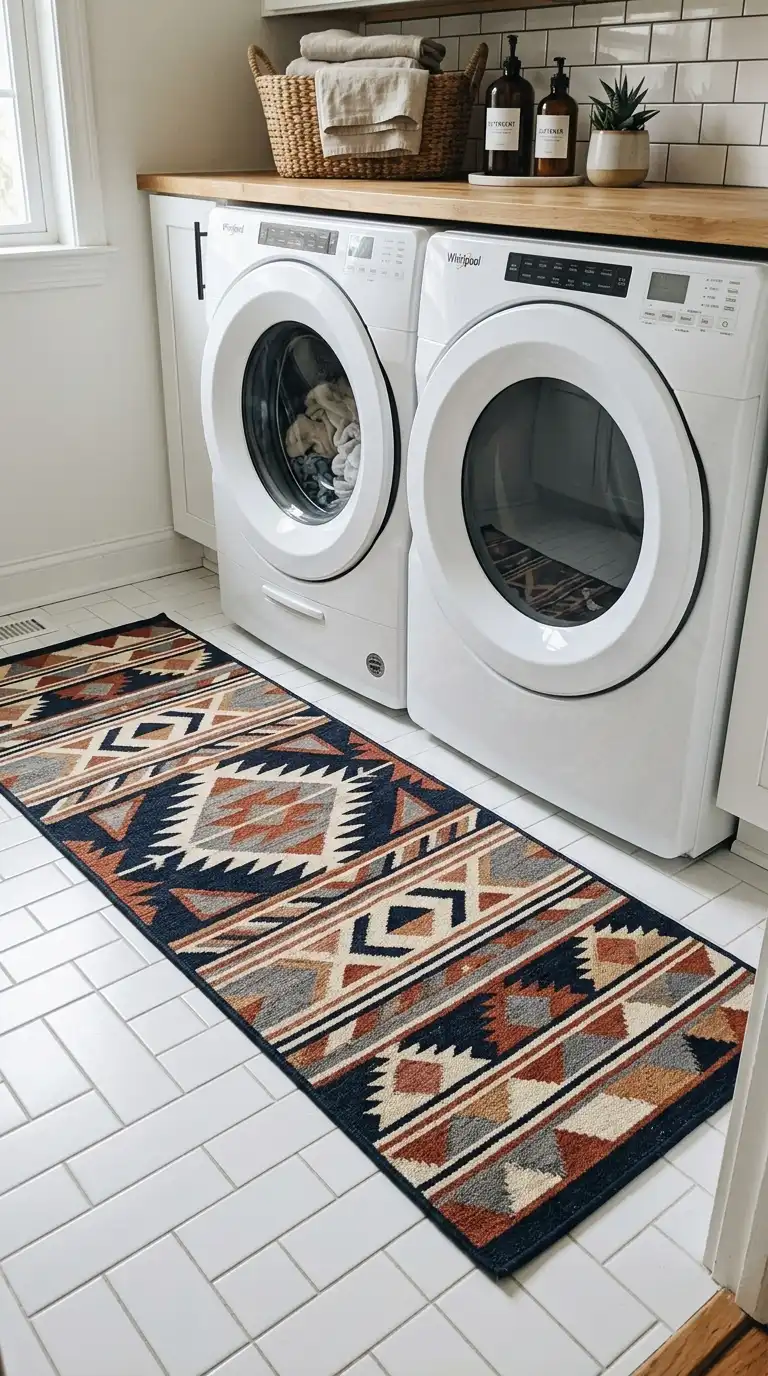 A washable rug or runner adds warmth, color, and comfort underfoot. Choose a rug with a low pile that is easy to clean and resistant to moisture. Indoor-outdoor rugs are a great option for laundry rooms. Look for patterns or colors that tie into your decor. A runner placed in front of the washer, dryer, and sink makes standing for long periods more comfortable.
