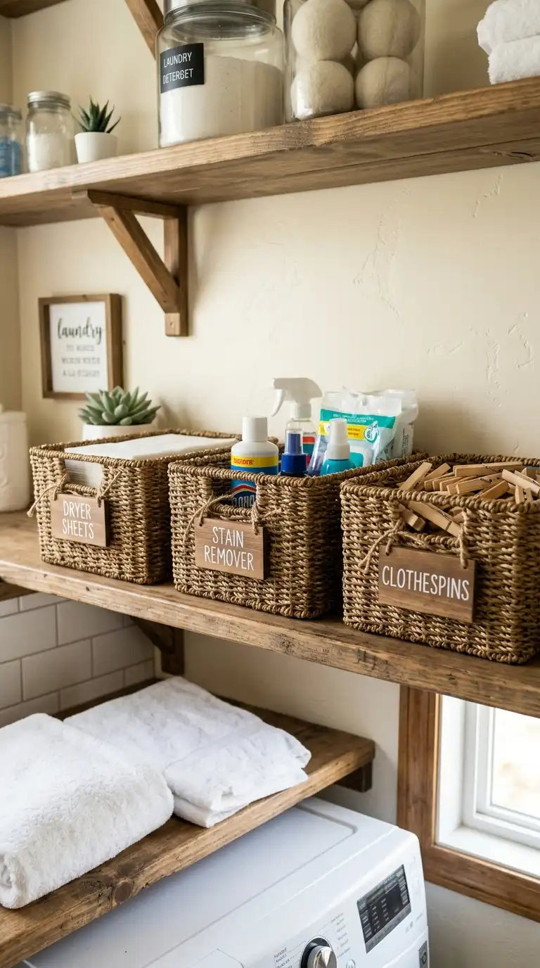 Replace plastic laundry baskets and utilitarian bins with decorative woven baskets, fabric bins, or metal buckets. Use them to store dryer sheets, stain removers, clothespins, and other supplies. Label each basket with a chalkboard tag or a simple printed label. Group matching baskets on open shelves or inside cabinets.