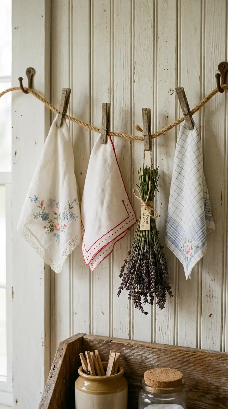 A vintage clothesline isn’t just for drying clothes—it can also be a decorative element. String a cotton clothesline across an empty wall, and use small clothespins to attach pretty items like vintage linens, greeting cards, or dried flowers. Even when not in use, the clothesline adds a nostalgic, farmhouse touch.
