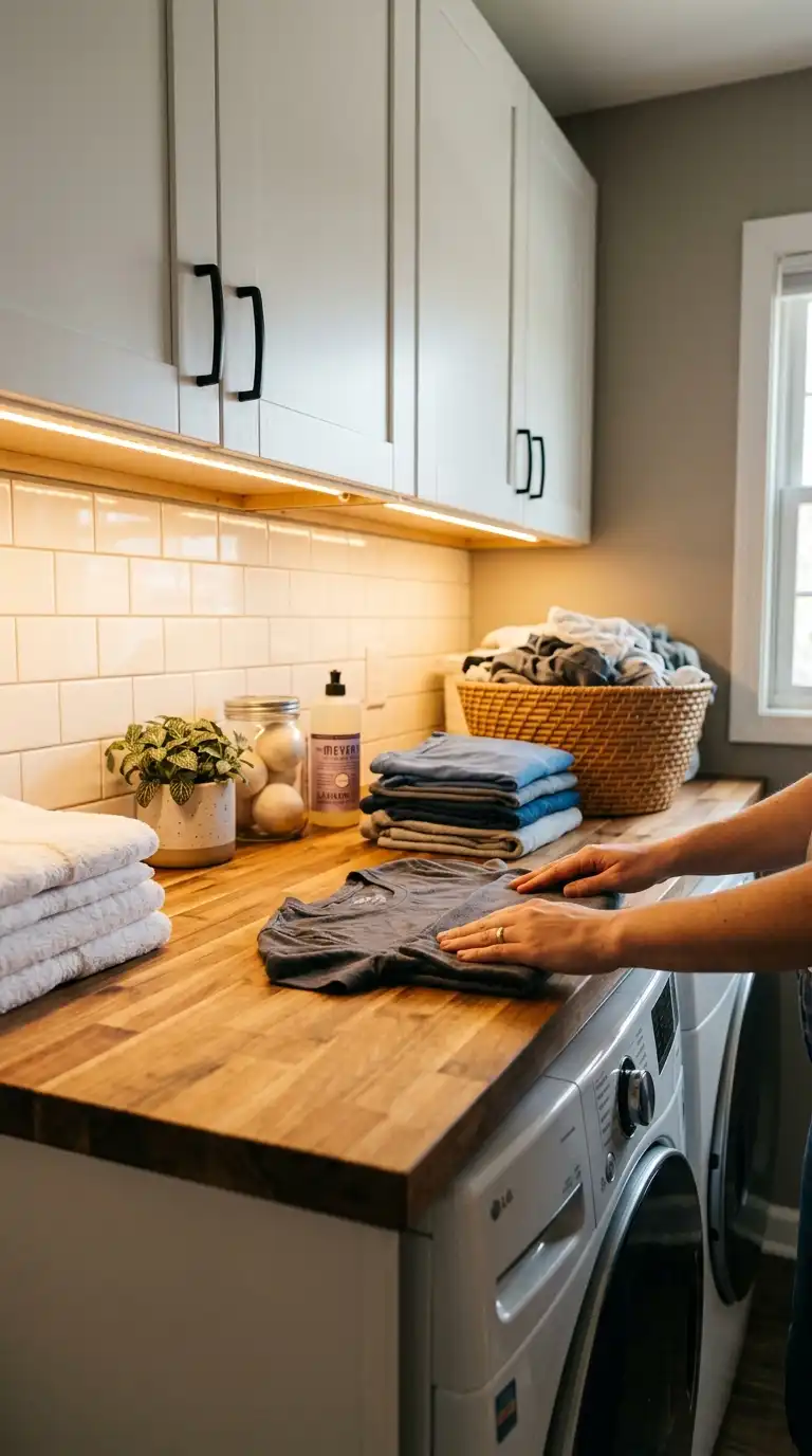 Under-cabinet lighting brightens the workspace, making it easier to spot stains and sort clothes. It also adds a warm, inviting glow to the room. Use LED strip lights or puck lights that can be plugged in or hardwired. Position the lights under wall cabinets above the folding counter or the washer and dryer.