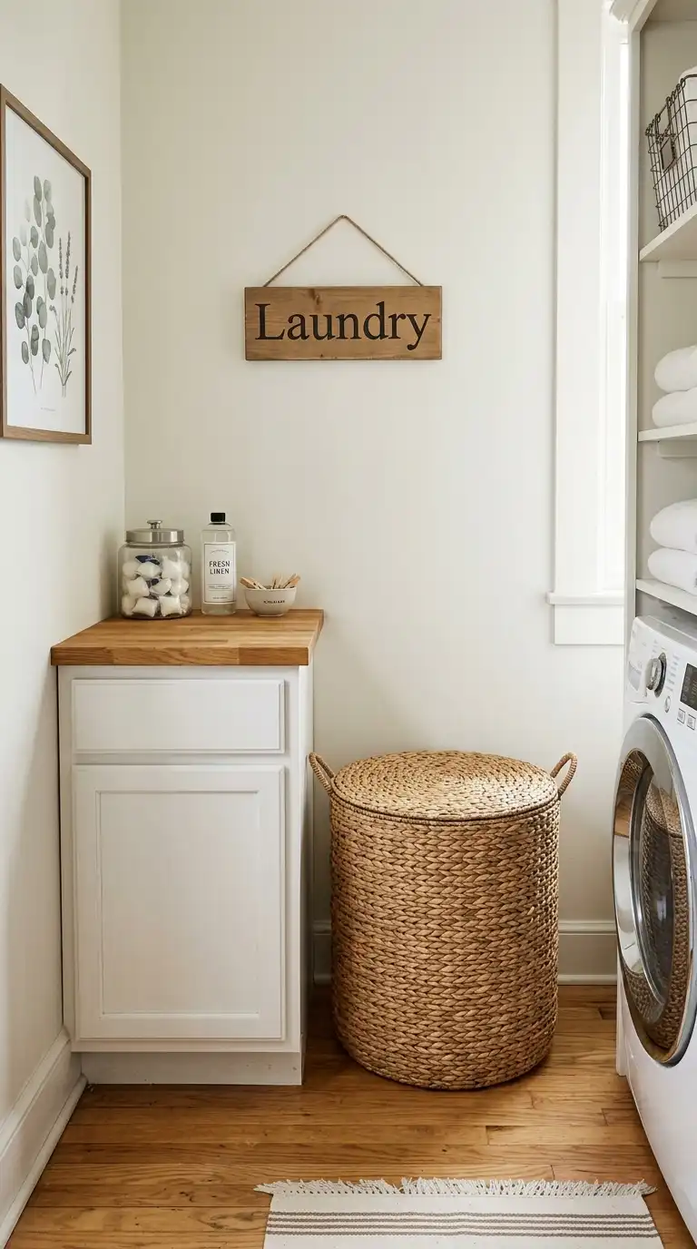 Your laundry hamper can be a decor piece, not just a utility item. Choose a vintage-style wire basket, a woven seagrass hamper with a lid, or a painted metal can. Place it in a visible corner where it can be both functional and attractive. A decorative hamper elevates the entire room.