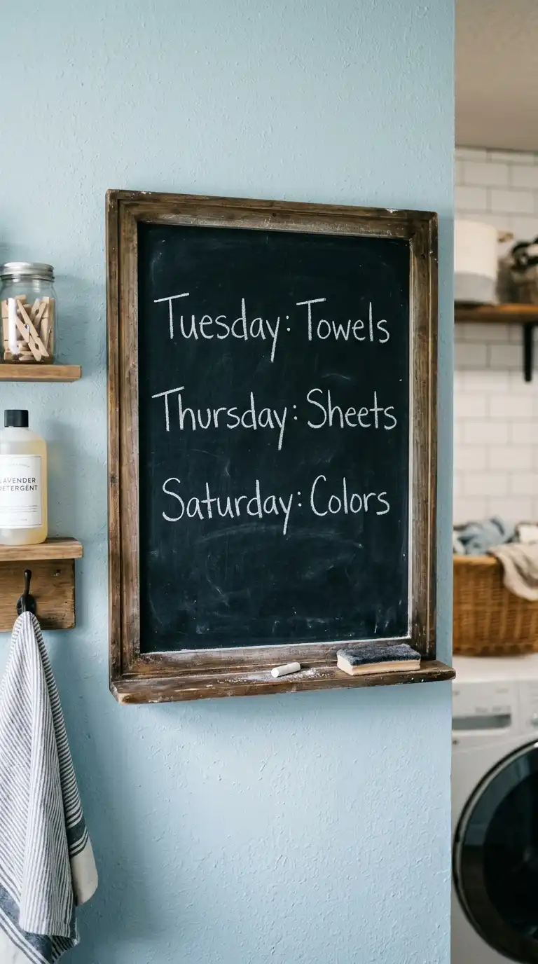 A chalkboard or whiteboard is both functional and decorative. Use it to write reminders, grocery lists, or a laundry day schedule. Mount a framed chalkboard on the wall, or paint a section of the wall with chalkboard paint. A small whiteboard with a marker holder can also be attached to a cabinet door.