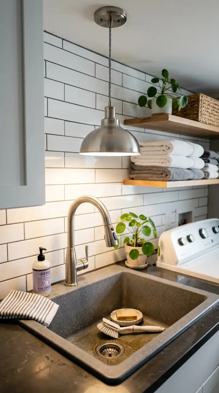 Add a pendant light directly over your utility sink to provide focused task lighting. Hang it at a height that illuminates the sink basin without casting shadows. Choose a metal or glass shade that directs light downward. This also adds a decorative element to the room.