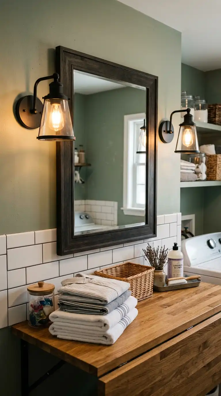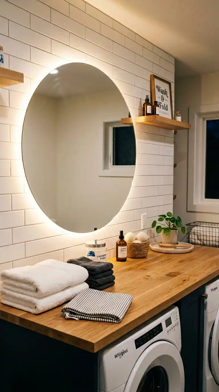 A backlit mirror adds both function and ambiance. Install a mirror with LED lights behind it above your folding counter or utility sink. The even, shadow-free light is perfect for checking stains or for a quick appearance check before leaving the house.