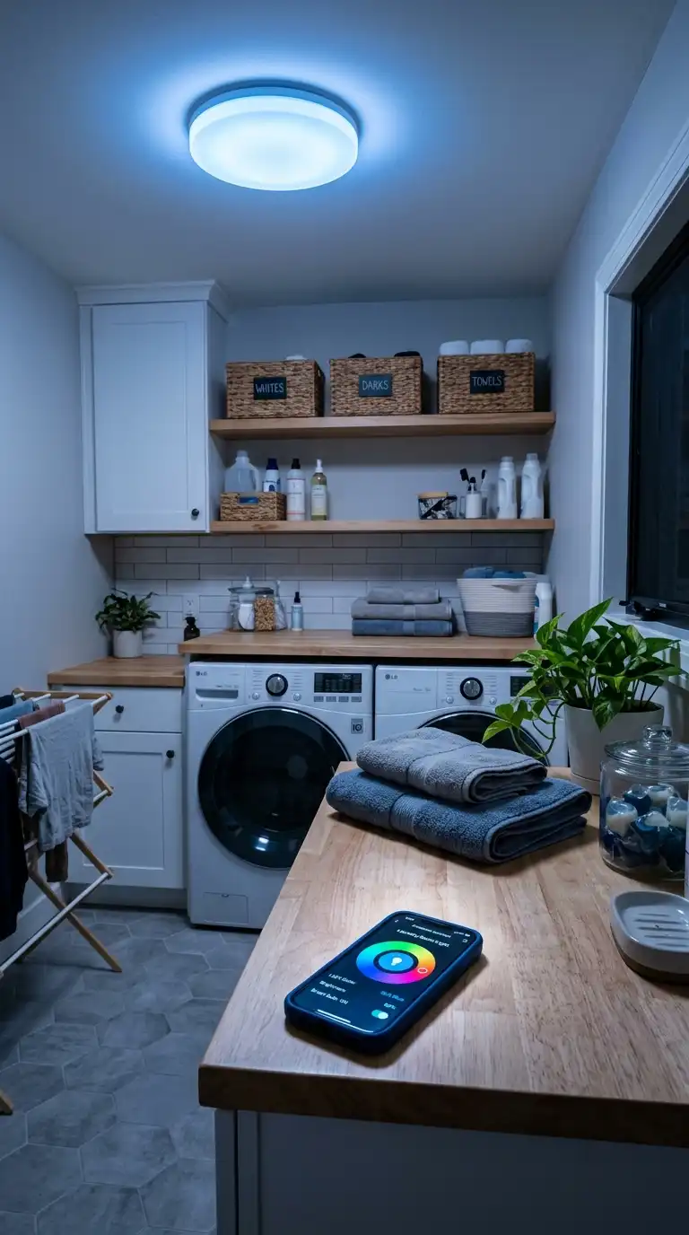 For a fun, customizable option, use color-changing smart bulbs in your laundry room fixtures. Set the lights to bright white for cleaning and sorting, then change to a soft blue or warm amber for a relaxing vibe. Control the lights with your phone or voice assistant.