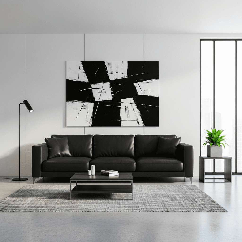 A sleek, low-profile leather couch in deep charcoal or black. This design focuses on sharp lines and is often paired with monochromatic art and polished concrete floors.