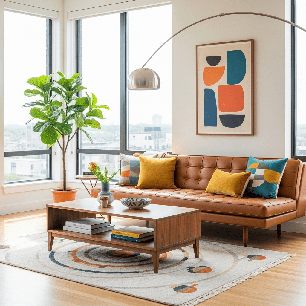 A tan or cognac leather sofa with tapered wooden legs and tufted cushions. This design works perfectly with walnut furniture and geometric rugs to create a warm, nostalgic vibe.