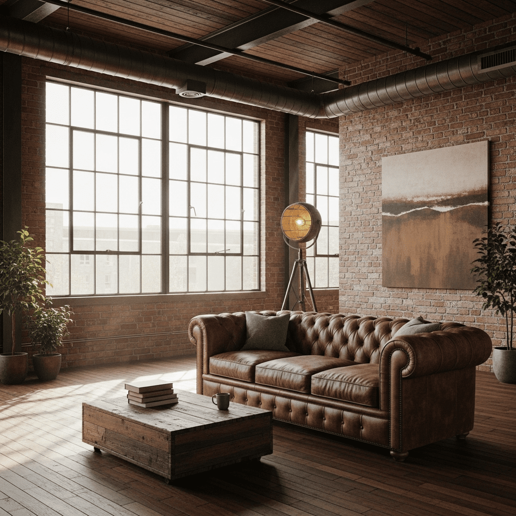 A classic tufted leather sofa with a worn-in, distressed finish. Set against exposed brick and metal piping, it brings a sense of history to an industrial space.
