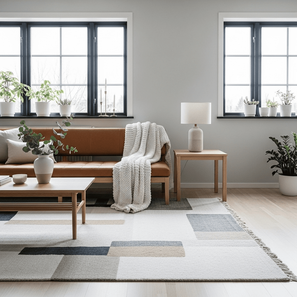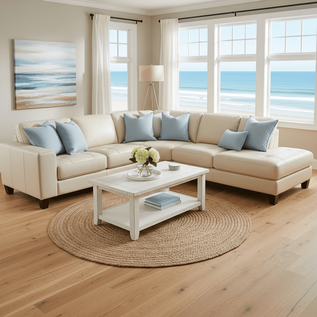 A soft, cream-colored leather sectional paired with light wood accents and nautical textures like jute and linen. It’s a clean, breezy take on traditional leather.