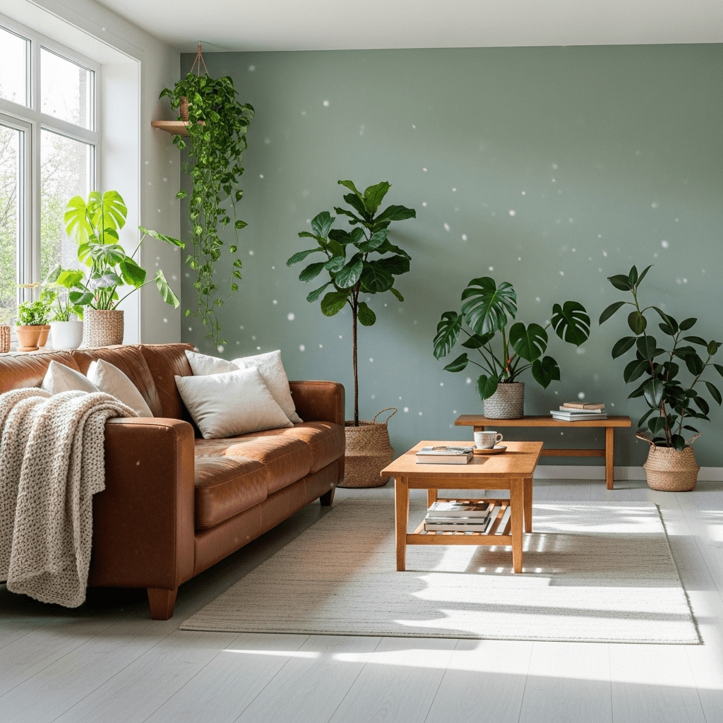 Combining a rich brown leather couch with a palette of sage green walls and an abundance of indoor trees. The natural textures work in harmony to create a serene retreat.