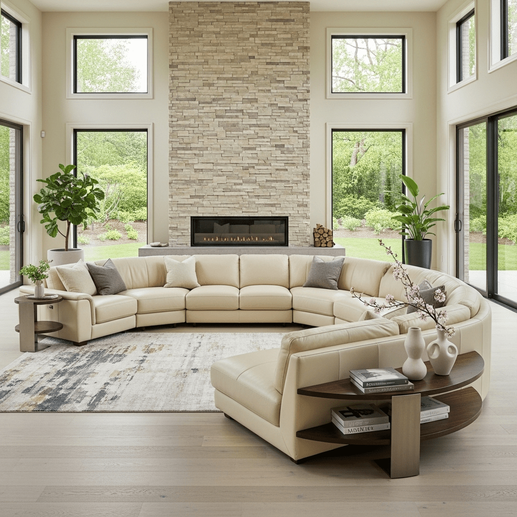 A large, sculptural leather sectional with rounded edges and no visible legs. It creates a “conversation pit” feel that is perfect for large, open-concept homes.