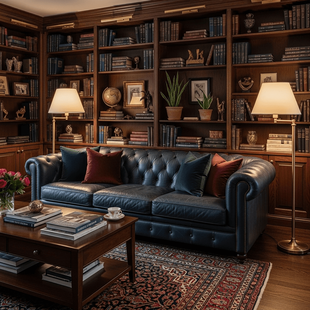 A navy blue leather sofa paired with brushed brass hardware and dark wood shelving. This design is intellectual, cozy, and perfect for evening relaxation.