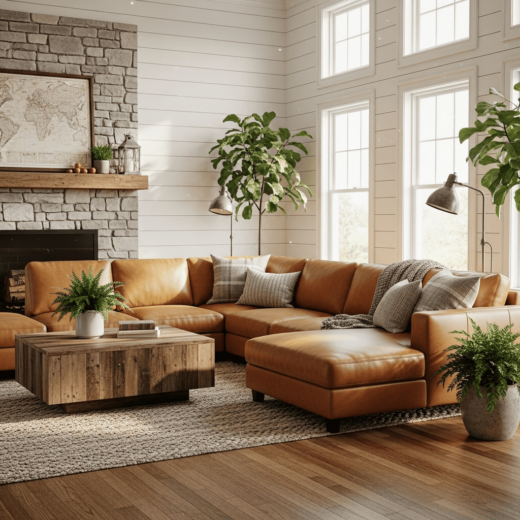An oversized L-shaped leather couch in a matte honey-brown finish. It’s the centerpiece of a room filled with reclaimed wood and white shiplap walls.