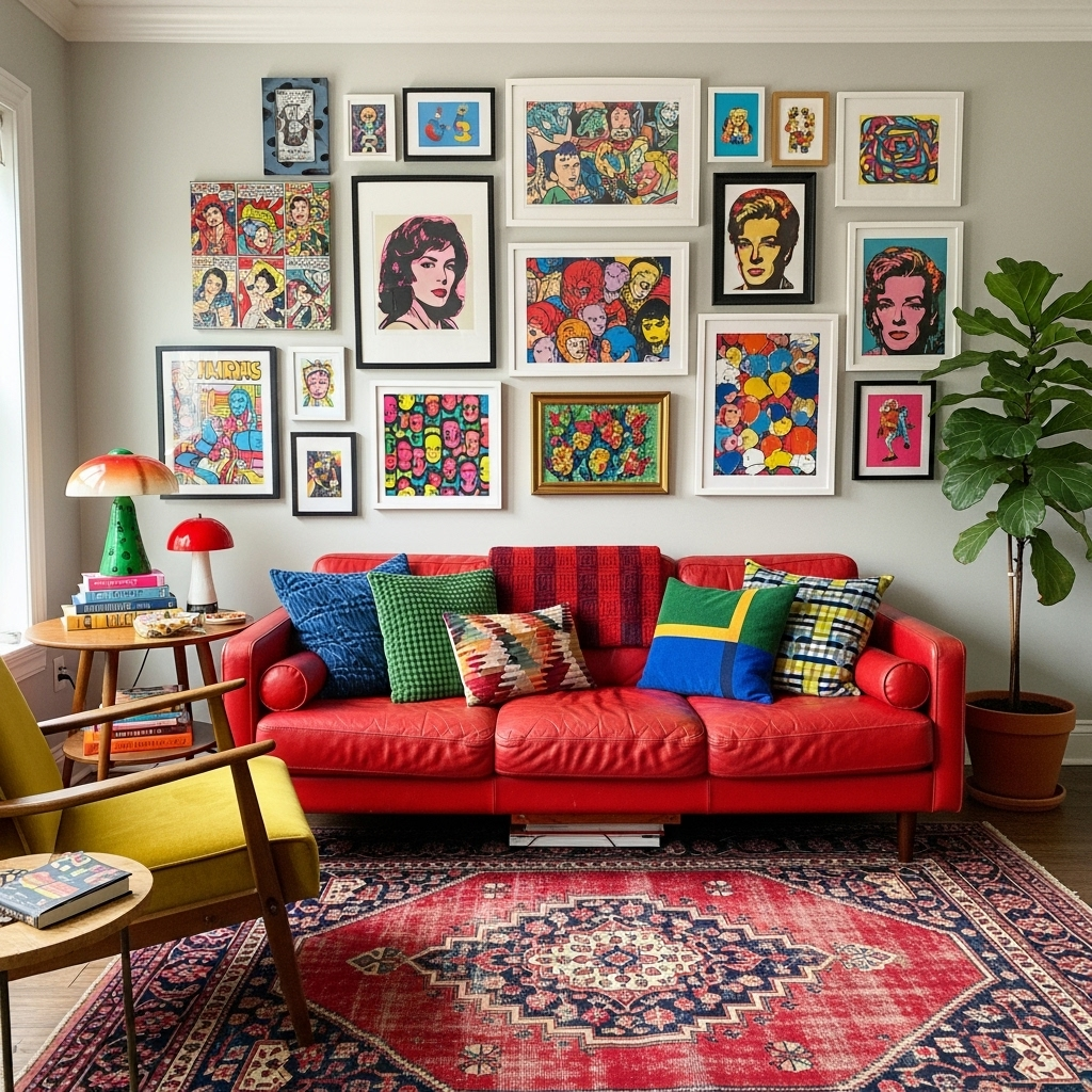 A bright red or yellow leather sofa set in a room filled with mismatched vintage decor and colorful pop art. It’s a high-energy design for those who love to experiment.
