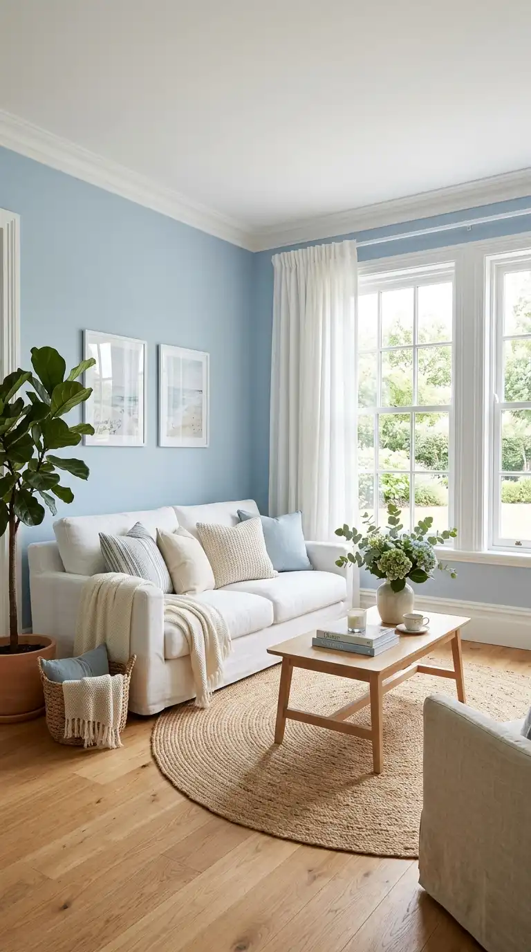 Light blue walls create an instant sense of serenity and openness. The soft hue reflects light beautifully, making rooms feel larger and more expansive. Crisp white trim—crown molding, baseboards, window frames—provides essential contrast that defines the architecture and adds crispness. White ceilings enhance the airy feel while allowing the blue walls to envelop the space gently.
