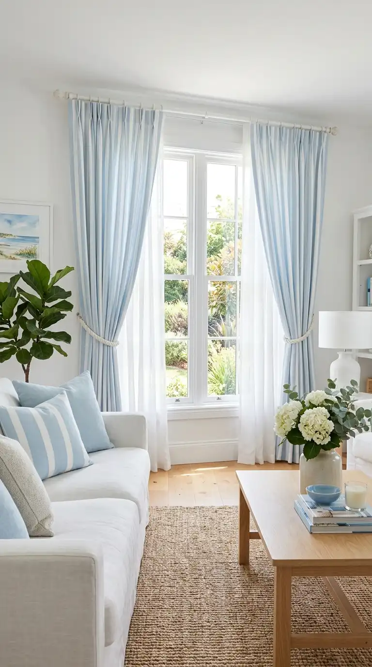 Striped curtains in light blue and white add pattern and movement while maintaining a classic, timeless appeal. Vertical stripes draw the eye upward, making ceilings appear higher and rooms more expansive. Choose soft blue stripes against white for maximum freshness, and hang curtains high and wide to maximize window size and light.