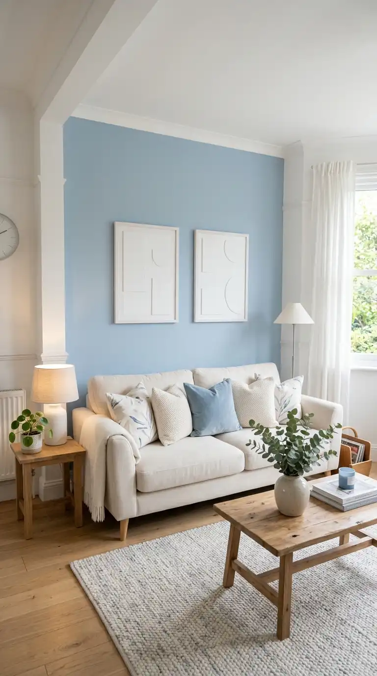 A light blue accent wall adds soft color without overwhelming the room. Choose one wall—behind the sofa, behind a media console, or in a dining area—and paint it in your preferred shade of soft blue. Keep surrounding walls white or cream to maintain brightness while letting the accent wall provide subtle interest and depth.