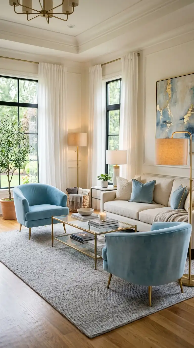Light blue velvet accent chairs add a touch of luxury and soft color without the commitment of a full sofa. Place two chairs opposite a neutral sofa or flanking a fireplace for symmetrical elegance. The plush texture of velvet catches light beautifully, while the soft blue hue adds freshness and sophistication.