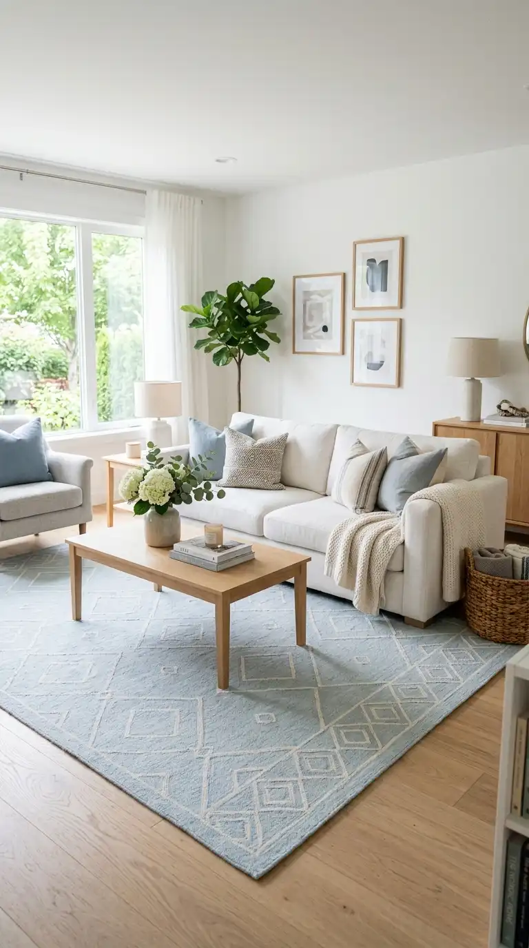 A light blue area rug anchors the seating area while adding soft color and texture. Choose a rug in powder blue or soft aqua with subtle pattern—geometric designs, traditional motifs, or abstract prints—to add visual interest. The light rug brightens the space while providing a cohesive foundation for furniture above.