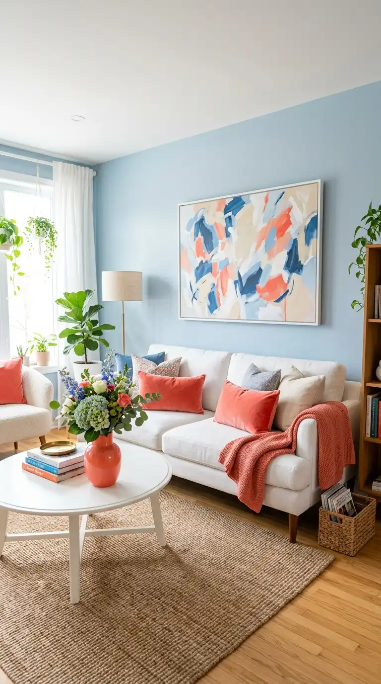 Light blue and coral create a fresh, energetic combination that feels playful yet sophisticated. The cool softness of blue provides perfect contrast for warm coral accents. Introduce coral through pillows, throws, artwork, or smaller accessories against light blue walls or furniture. The combination evokes coastal sunsets and feels endlessly cheerful.