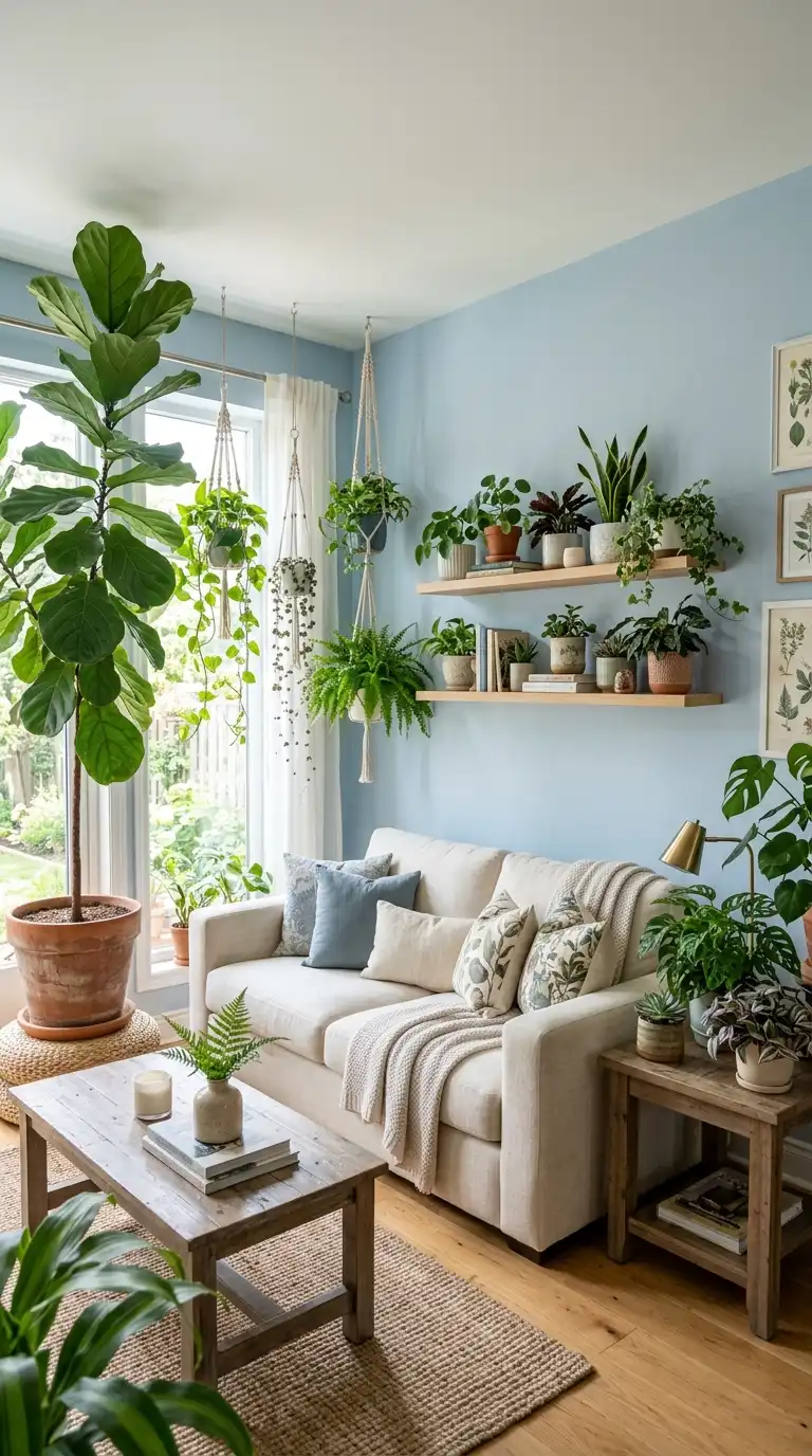 Light blue provides the perfect backdrop for an abundance of green plants, creating spaces that feel fresh, alive, and deeply connected to nature. The soft blue tones complement every shade of green, from pale sage to deep forest. Surround your light blue sofa or accent wall with floor plants, hanging planters, and smaller specimens for an organic, nurturing environment.