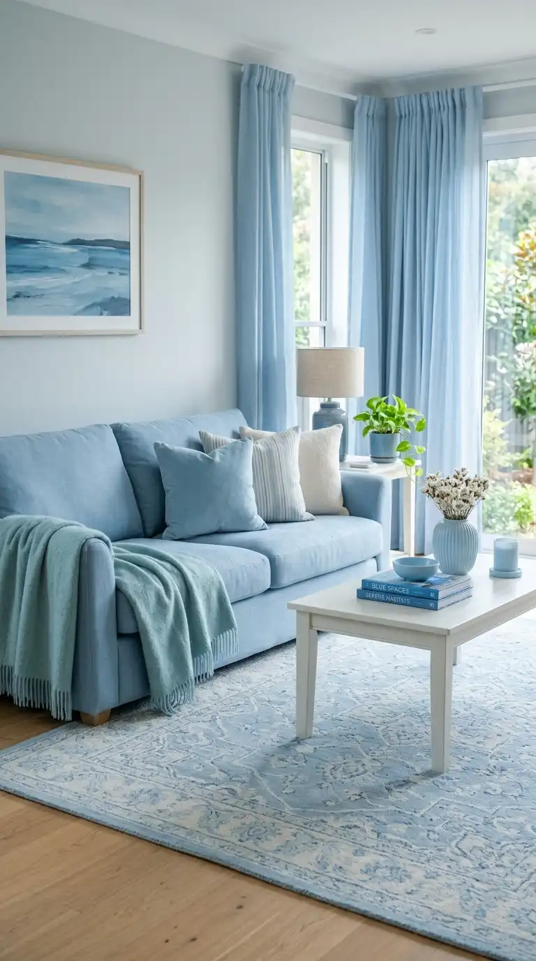 Layering multiple shades, textures, and patterns of light blue creates depth and interest while maintaining a serene, cohesive palette. Think powder blue sofa, sky blue curtains, soft aqua throw, and a blue patterned rug with varying light blue tones. The variety of textures—linen, velvet, cotton, wool—prevents the monochromatic scheme from feeling flat while the unified color family ensures harmony.