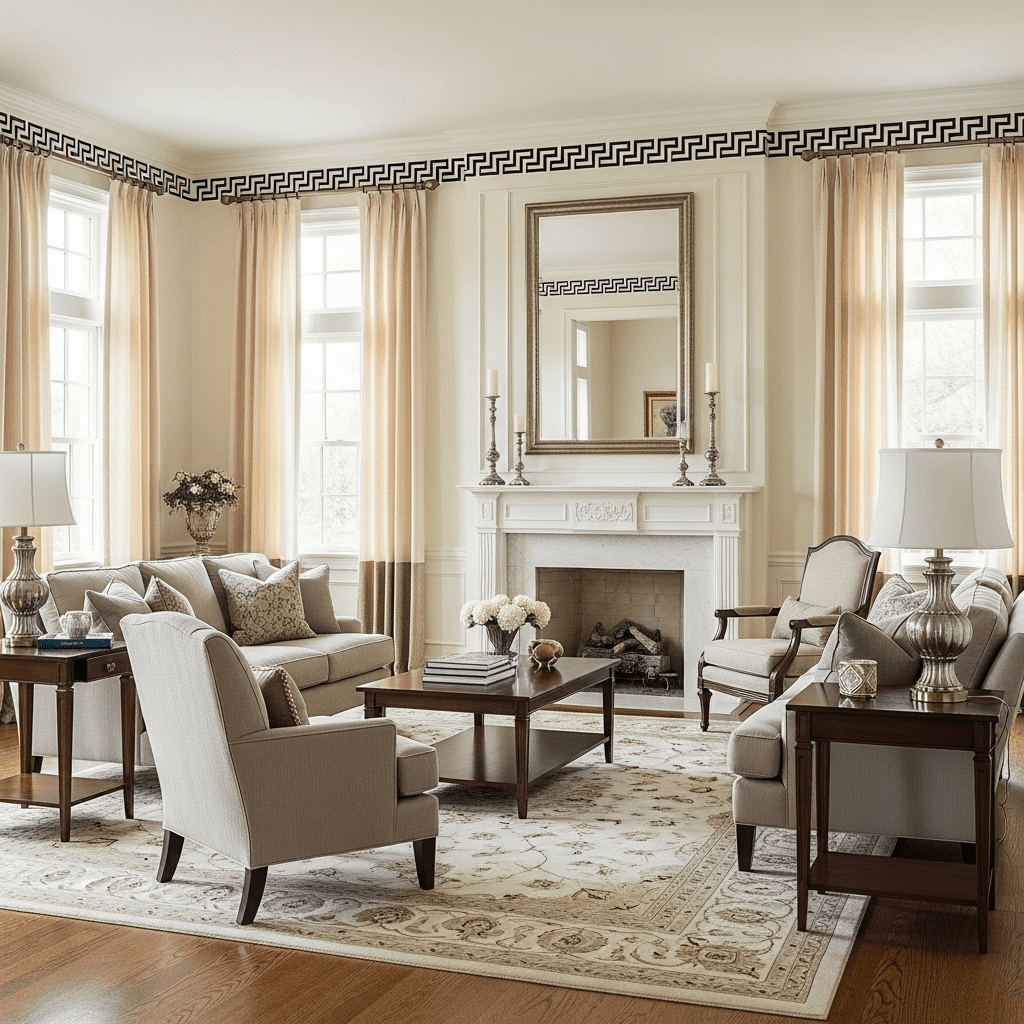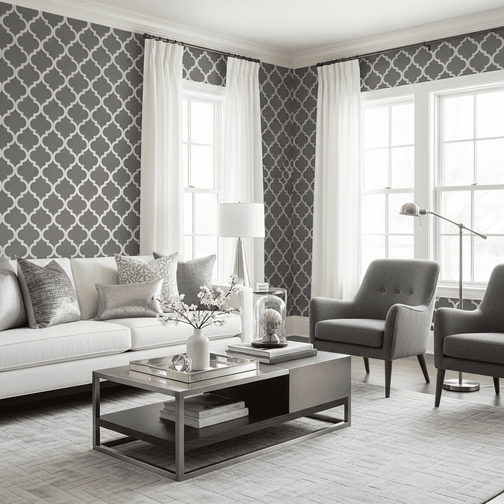 A classic fretwork pattern that brings an exotic, architectural feel to the room. Using a tone-on-tone color scheme—such as matte gray on a satin gray wall—creates a subtle, high-end look.