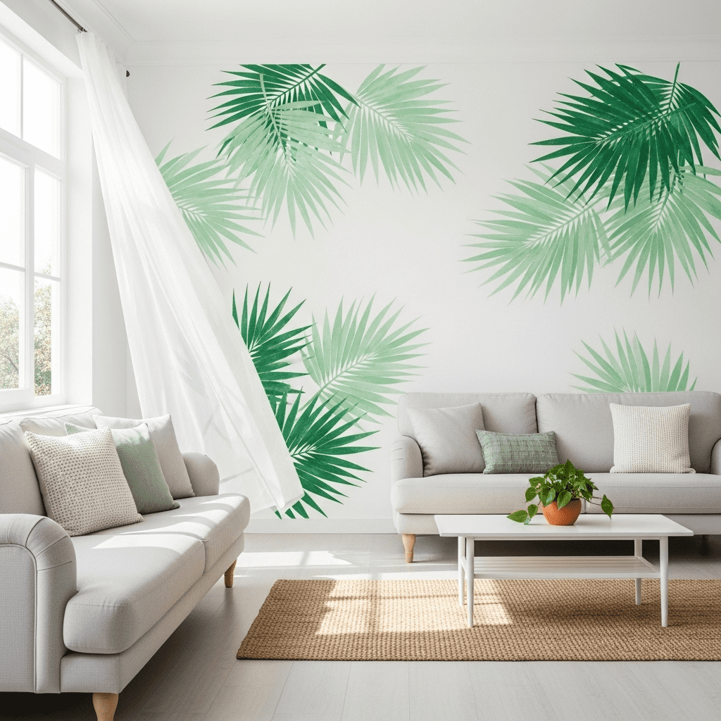 Moving away from repetitive patterns, this design uses large, individual leaf stencils placed sporadically to create a custom botanical mural effect.