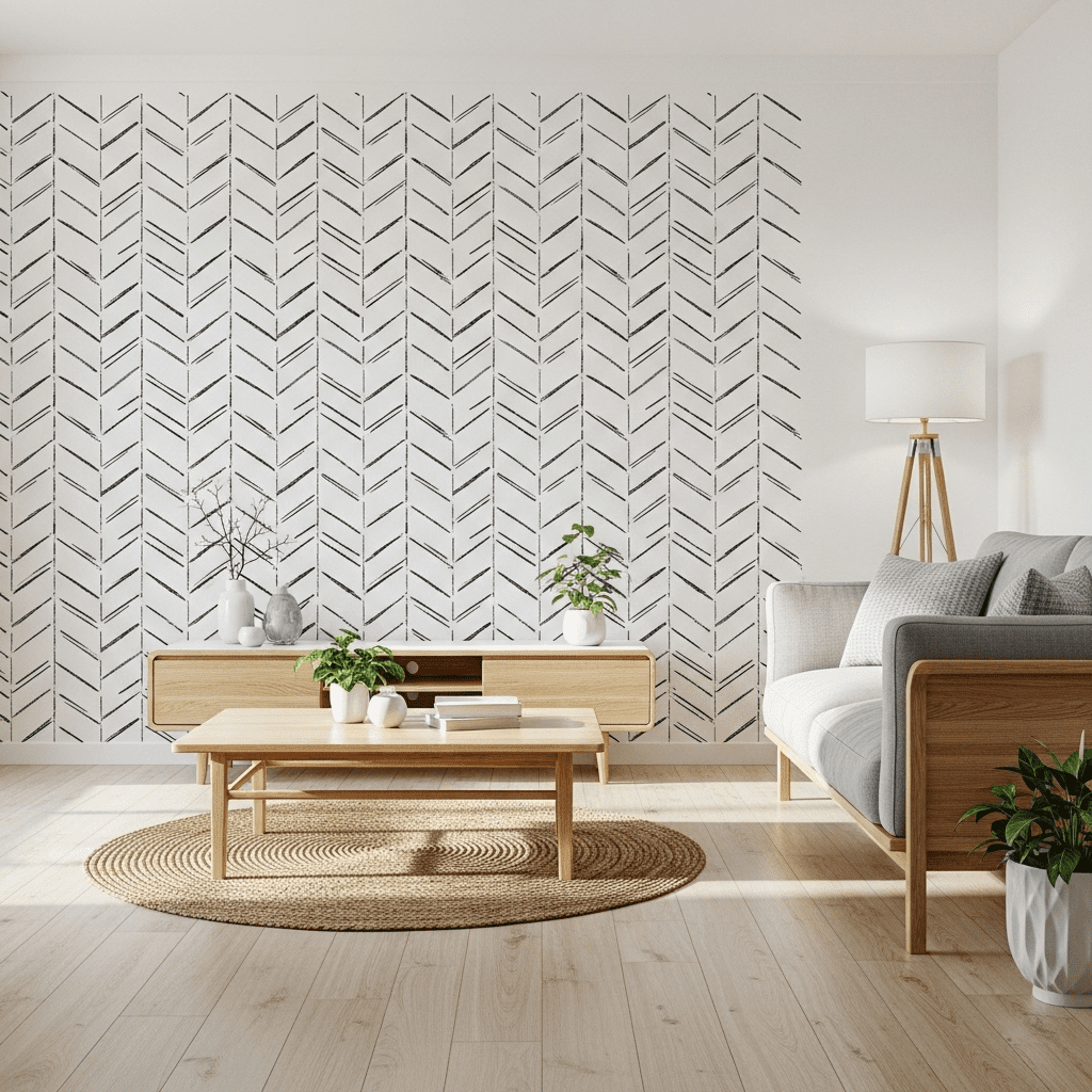 A modern take on a traditional pattern, using thin, slightly imperfect lines to mimic a hand-inked herringbone design. It adds texture without overwhelming the space.