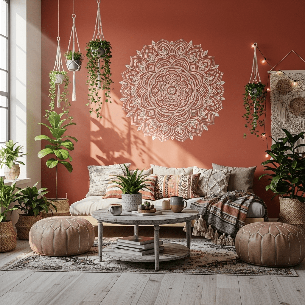 Instead of covering the whole wall, a single, large-scale mandala stencil is centered behind a sofa or fireplace to act as a spiritual and visual focal point.