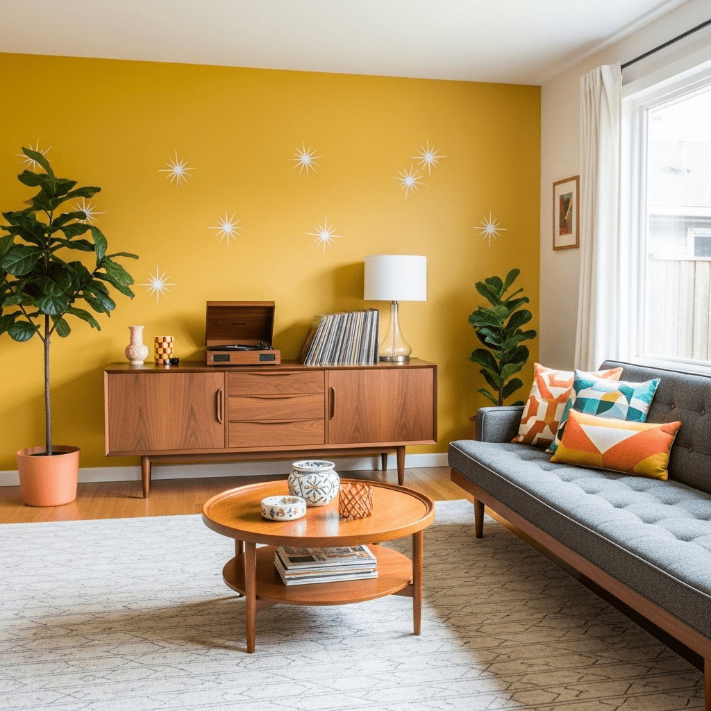 Playful and nostalgic, this design features repeating atomic-era starburst shapes. It is the perfect backdrop for vintage furniture and retro-modern decor.