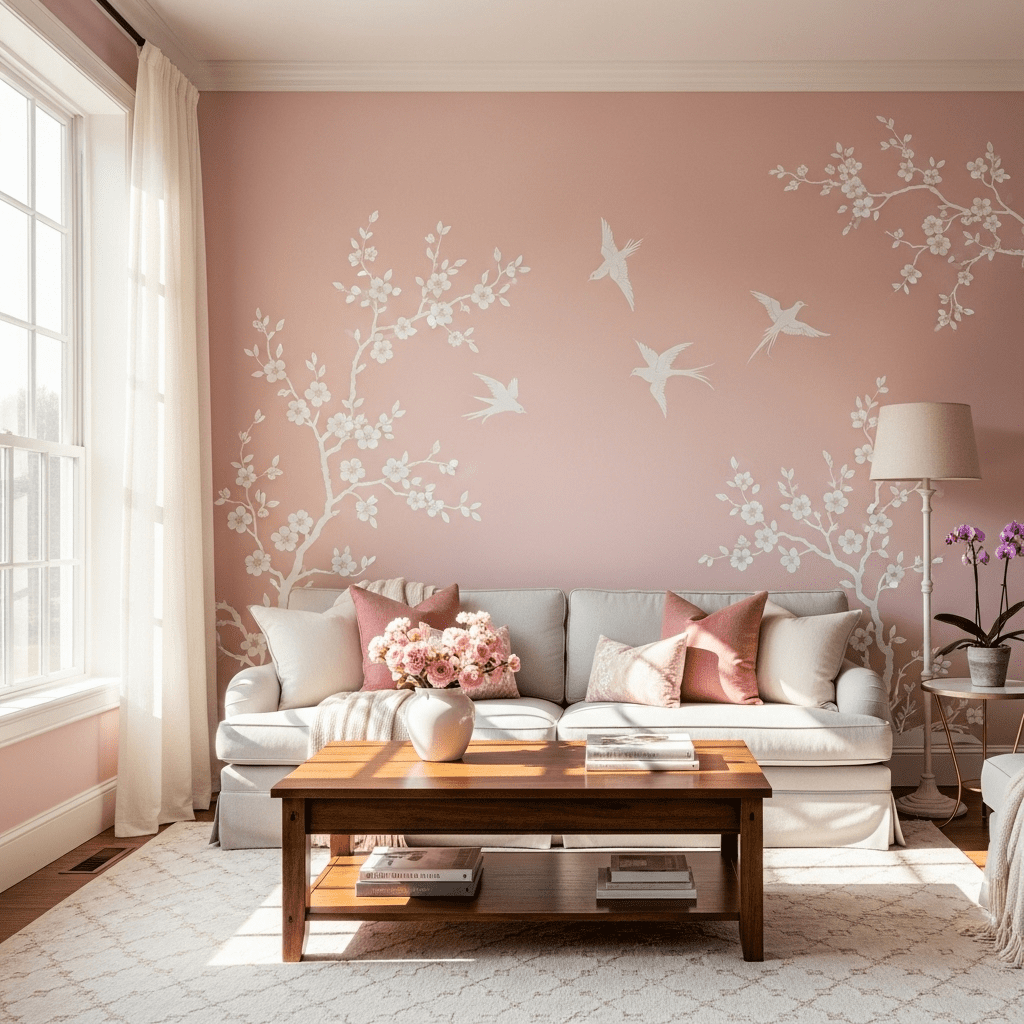 A delicate and romantic design that mimics hand-painted silk panels. Thin branches, blossoms, and small birds are stenciled in soft pastels for a serene atmosphere.