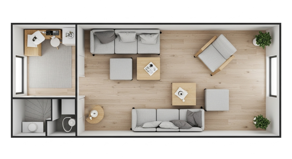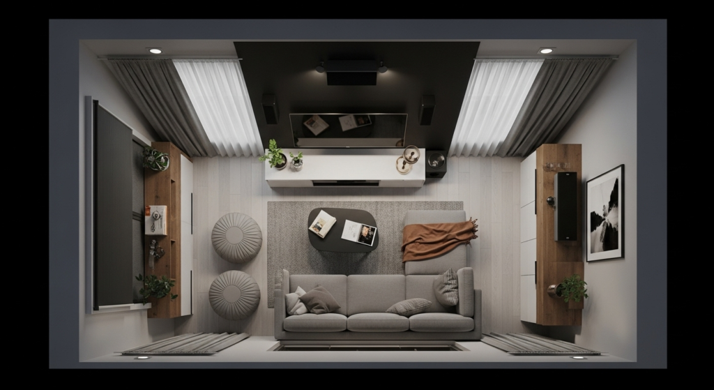 Create Zones Intentionally: Even in small narrow spaces, creating distinct zones for different activities (watching TV, reading, working) makes the space more functional and feels more spacious.