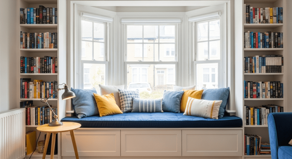 Choose chairs with personality—velvet armchairs, leather wingbacks, or mid-century modern accent chairs—that make the area feel designed and intentional. Layer with throws and pillows for comfort, and add a floor lamp for evening use. The bay window’s natural light makes this conversation area feel special during the day, while the enclosed feeling creates intimacy in the evening.