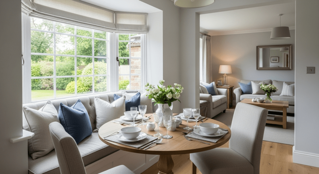 Install built-in bench seating along the bay window’s back wall with cushions and pillows for comfort. Position a small rectangular or round table in front that can accommodate 2-4 people. The morning light streaming through the bay window makes this an ideal spot for breakfast and coffee, while the cozy enclosed feeling creates intimacy.