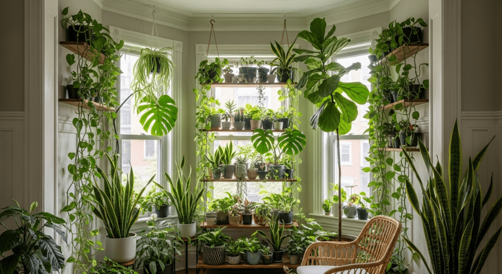 Install tiered plant stands or floating shelves at varying heights within the bay window to display a collection of plants—from small succulents to large fiddle leaf figs. Mix plant sizes, textures, and colors to create a lush, layered look. Use the window seat or bench as additional plant display space, with trailing plants like pothos cascading down.
